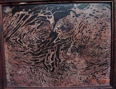 Title: Evolution (Plastograph Prints). A series of experimental prints that was done with various materials. This consisted of: paint, plastic, and chemicals. 40% control and 60% by chance. Size: 18" x 32". Year Painted: 1969